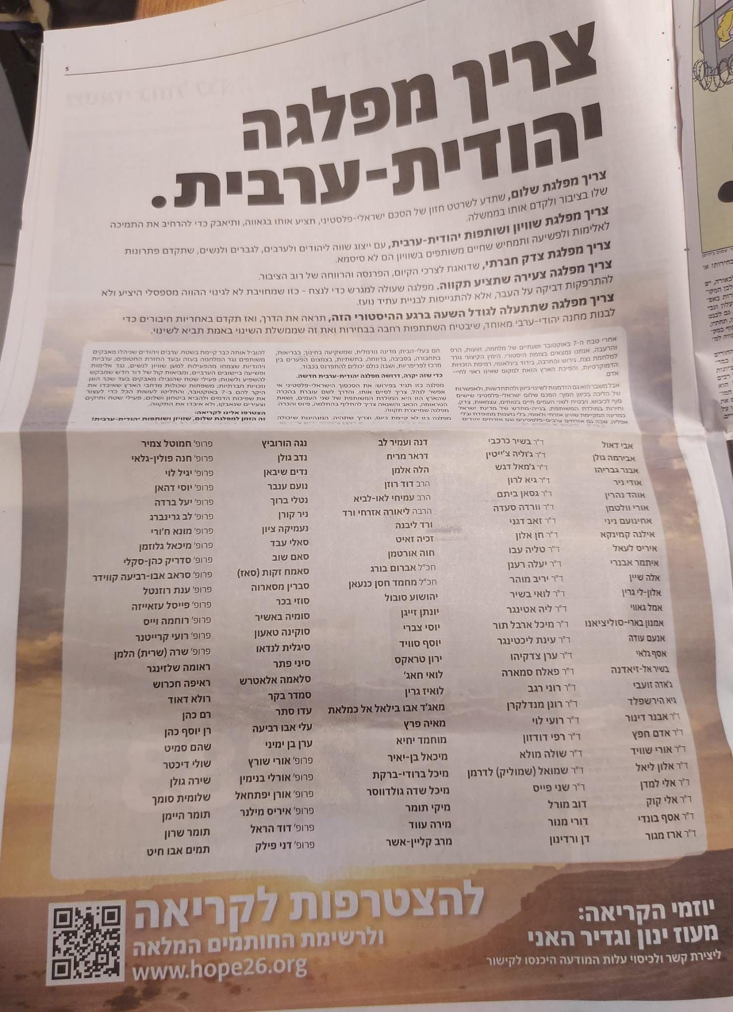 130 شخصية جماهيرية من المجتمع العربي واليهود التقدميين يوقعون على نداء لإقامة حزب يهودي عربي جديد