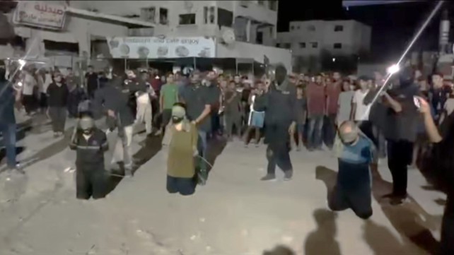 نفّذت حماس، وسط حضور جماهيري واسع، إعدامًا علنيًا لثلاثة فلسطينيين في قلب مدينة غزة، بعد أن تم تغطية أعينهم وإطلاق النار عليهم أمام المئات من مؤيدي التنظيم، وسط هتافات "الله أكبر" وصيحات مؤيدة للكتائب العسكرية التابعة لحماس.